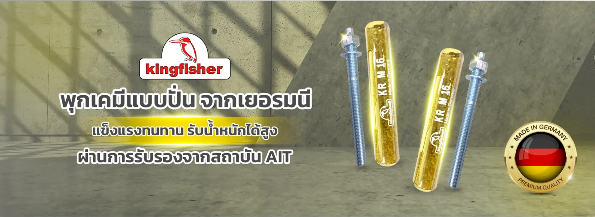 พุกเคมี คิงฟิชเชอร์ (Kingfisher Chemical Anchor Bolt) นำเข้าจากเยอรมนี เหมาะสำหรับงานโครงสร้าง ที่ต้องการความแข็งแรงสูง รับน้ำหนักได้มาก ทนทานระยะยาว ผ่านการรับรองมาตรฐาน ติดตั้งง่ายรวดเร็ว ยึดเกาะดีเยี่ยมใช้ได้ทั้งติดตั้งเครื่องจักร เสริมโครงสร้างเหล็กคอนกรีต ติดตั้งรั้วเหล็ก กันสาด ป้าย